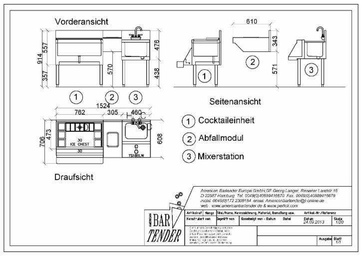 Zeichnung für Projekt Corp Berlin 2 Arbeitsplätze, 2 Glaslagerschränke,1 Freezer,Spüle mit 2 Becken, Spülmaschine Glasfroster, Flaschenbox mit MBS Struktur